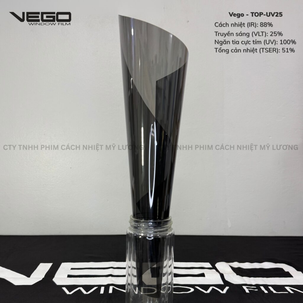 Sản phẩm TOP-UV25 của thương hiệu VEGO là mã chuyên dụng dành cho kính lái. Mã film cách nhiệt sở hữu thông số ngăn hồng ngoại lên tới 88% cùng độ truyền sáng 25% giúp mang lại tầm nhìn tốt, không gian thoáng mát cho người trong xe. Ngoài ra mã TOP-UV25 còn rất phù hợp để lắp đặt cho nhà kính muốn giữ view, đảm bảo ánh sáng tự nhiên.